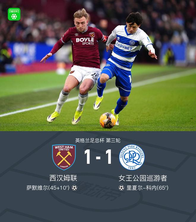 北京時(shí)間1月11日,英格蘭足總杯第三輪展開(kāi)較量,西漢姆聯(lián)迎戰(zhàn)女王公園巡游者。上半場(chǎng)補(bǔ)時(shí)階段,馬加薩送出助攻,薩默維爾抓住機(jī)會(huì)率先破門(mén),為球隊(duì)取得領(lǐng)先。易邊再戰(zhàn),卡拉莫科-登貝萊成功策動(dòng)進(jìn)攻,里夏爾-科內(nèi)完成破門(mén),幫助球隊(duì)扳平比分。最終雙方以1比1握手言和,進(jìn)入后續(xù)賽程。