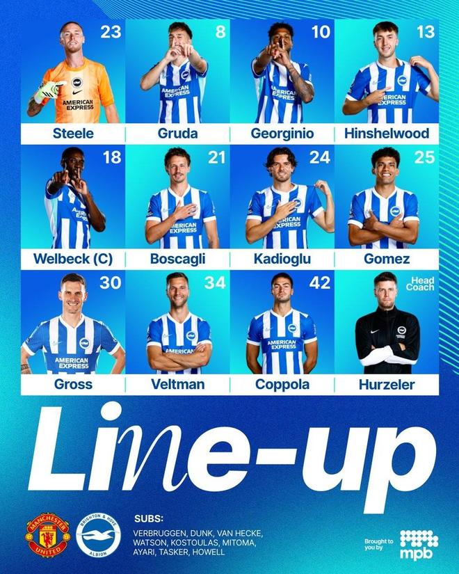 布萊頓首發(fā):23-斯蒂爾、42-科波拉、24-卡迪奧盧、21-博斯卡利、34-費爾特曼、13-欣謝爾伍德、25-戈麥斯、30-格羅斯、8-格魯達、10-呂特、18-維爾貝克
