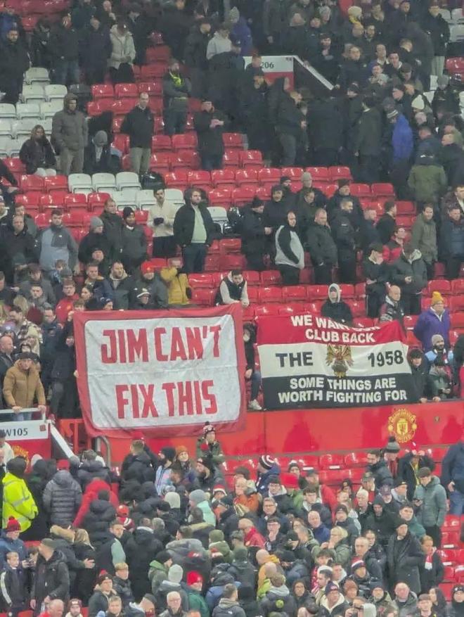 看臺(tái)上,球迷的橫幅刺痛了每一個(gè)紅魔擁躉的心:“吉米(拉特克利夫),解決不了這個(gè)”、“我們想要回我們的俱樂部”。