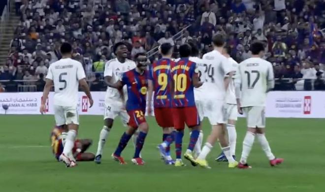 亞馬爾對這一舉動不滿,也張開雙臂,兩人隨即開始進一步爭吵和推搡,同時亞馬爾質(zhì)問赫伊森是否“瘋了”。亞馬爾的目標本是勞爾-阿森西奧,但赫伊森全程阻止他接近勞爾-阿森西奧。